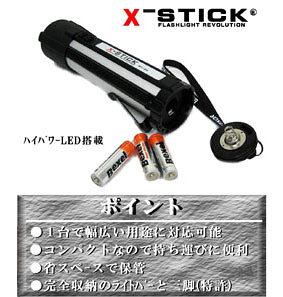 ハイパワーLEDを搭載し、懐中電灯・合図誘導灯・安全三角台の一台三役をこなします!ハイパワーLED搭載「X-STICK」価格: 8,900円レビュー評価: 0.0 レビュー数:0 ■素材:スイッチ/シリコン、ヘッド部/シリコン、ボディー/アルミニウム、脚部/ポリカーボネイト、乾電池部/ABS■サイズ:完全収納時220mm、ライトバー最大使用時533mm、レンズ部口径38mm、頭部口径59mm、手持部口径50mm、自立時最大H585mm■重量:380g(電池挿入時450g)■電源:単三電池3本(別売)■使用電球:ハイパワー白色LED搭載 1W700mmA(アメリカ製) 80?90ル-メン■製造元:韓国※このライトはLEDの特性上、色の個体差がありますが明るさはほぼ同等です。※このライトは強力な光を発し目には大変危険ですので直視したり、人や動物の目には絶対に照射しないで下さ |