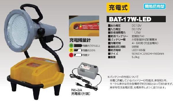 LEDバッテリーライトBAT-17W-LED 日動(NICHIDO)【送料無料】価格: 59,800円レビュー評価: 0.0 レビュー数:0 ハイパワーバッテリーライトLEDタイプより遠くに、広範囲を照らす!■出力電圧 DC12V■入力電圧 DC12V■定格消費電力 11.0W■使用バッテリー 密閉型7Ah■バッテリー種 小型制御弁式鉛蓄電池■充電時間 4?5時間(完全放電時)■連続点灯時間 9時間■使用電球 LED165個■サイズ W265×D260×H465mm■重量 5.2g充電式簡易防雨型充電器付属 |