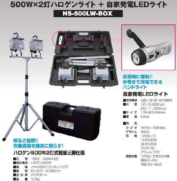 非常用防災照明セットHS-500LW-BOX 日動(NICHIDO)【送料無料】価格: 23,900円レビュー評価: 0.0 レビュー数:0 非常時・防災時の照明に!明るさ抜群の500Wハロゲン2灯+三脚にラジオ、アラーム、携帯電話の充電機能が付いた自家発電LEDライトが1つのBOXに入った非常用防災照明セットです。■定格 100V 500W×2灯■適応電球 ハロゲン500W ■電線 アース付5m(ポッキンプラグ)■揚程 約1040?2090mm■全光束 20000Lm■重量 7.0kg |
