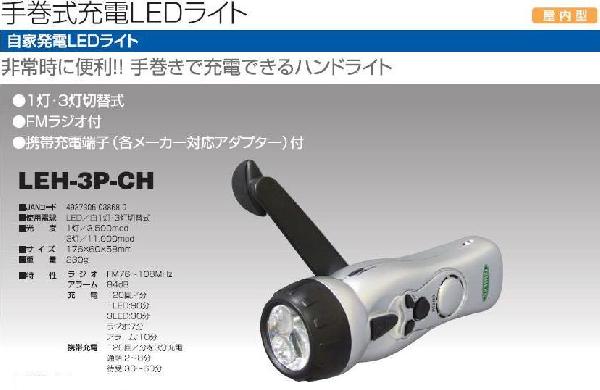 手動式充電ライトLEH-3P-CH 日動(NICHIDO)価格: 2,920円レビュー評価: 0.0 レビュー数:0 非常時に便利!手巻きで充電できるハンドライト■使用電球 LED/白1灯・3灯切替式■光度 1灯/3500mcd、3灯/11000mcd■サイズ 176X60X58mm■重量 230g■特性 ラジオ(FM76?108MHz)アラーム(84dB)充電(120回/分、1LED:90分、3LED:30分、ラジオ:7分、アラーム:10分 )携帯充電(120回/分を3分充電、通話:2?8分、待受:30?60分) |